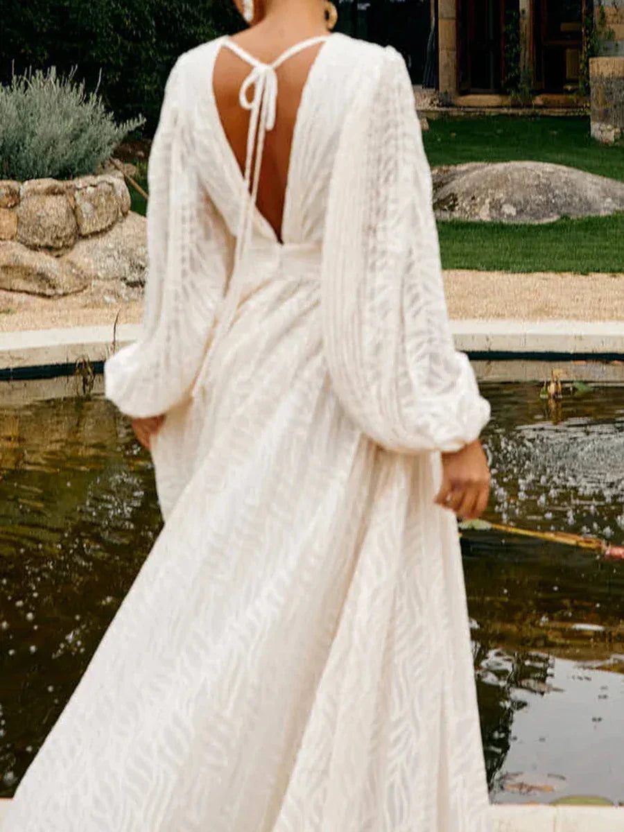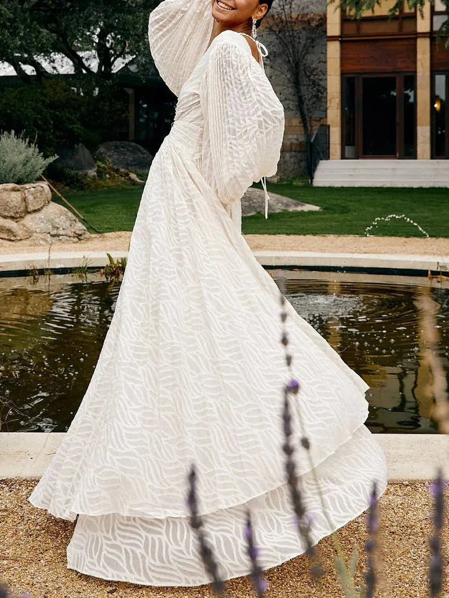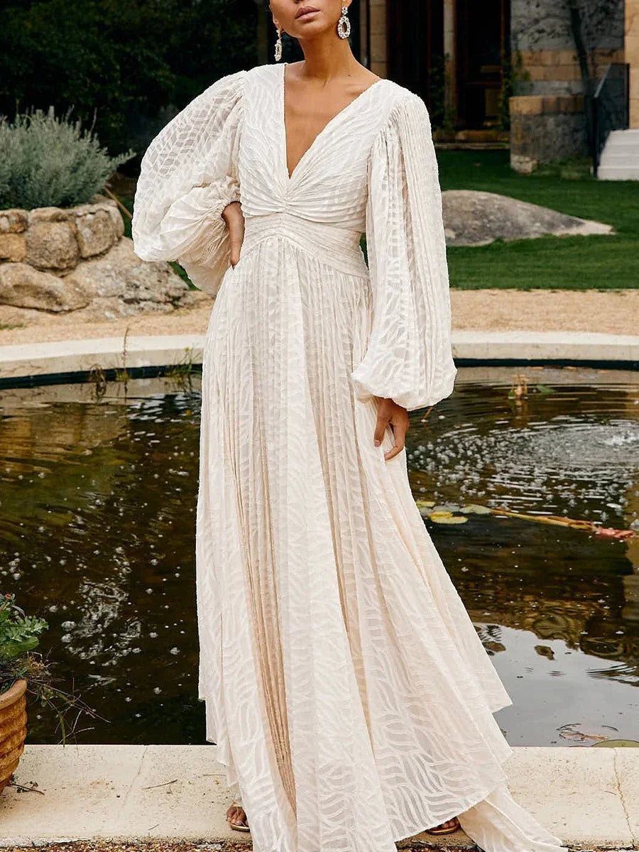 There’s elegance — and then there’s Jane. With her billowy sleeves, draped waist and timeless V-neckline, this dress flows like poetry in motion. Whether for a wedding, a sunset dinner or a moment just for you — Jane turns every step into a scene.