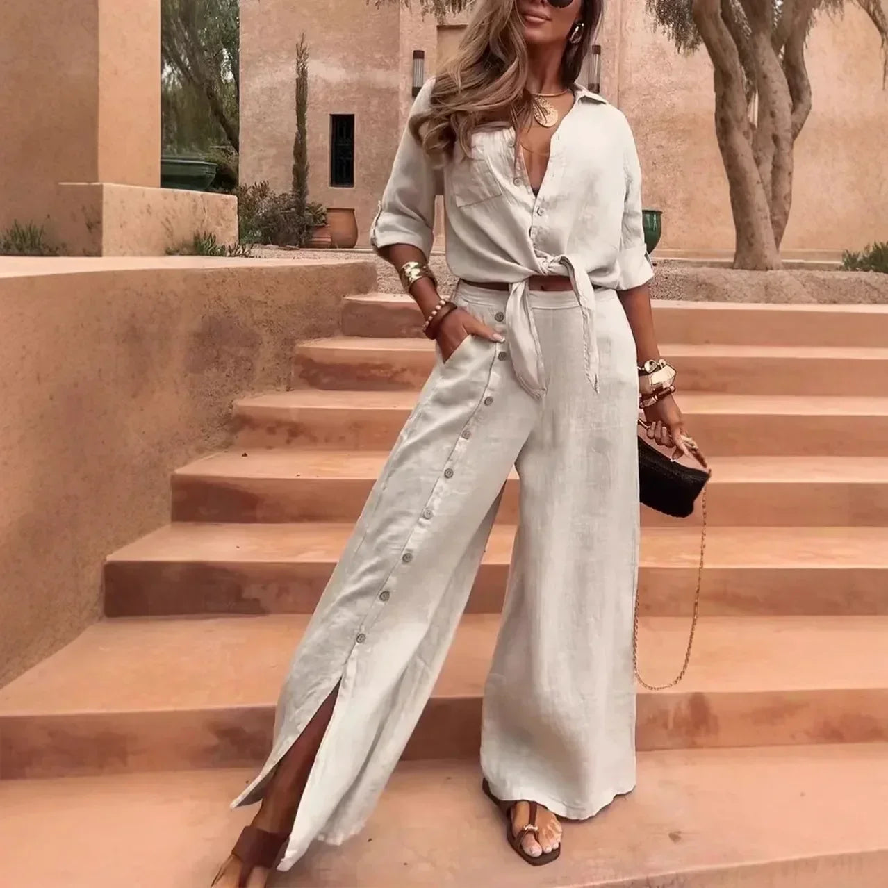 The Claire Set is the definition of laid-back luxury. Crafted for sunny escapes and stylish strolls, this two-piece ensemble features a relaxed button-up blouse with a subtle tie-waist, paired with wide-leg trousers finished with an elegant side slit and decorative buttons. Whether you’re wandering through cobblestone streets or sipping cocktails at sunset, Claire moves with grace—and makes a statement without trying.