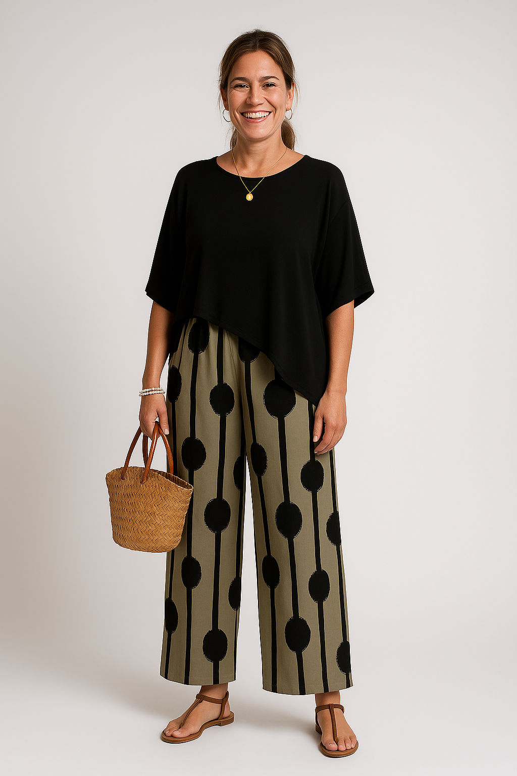 • Statement Trousers – Wide-leg pants with a bold, artistic print instantly elevate your summer wardrobe.