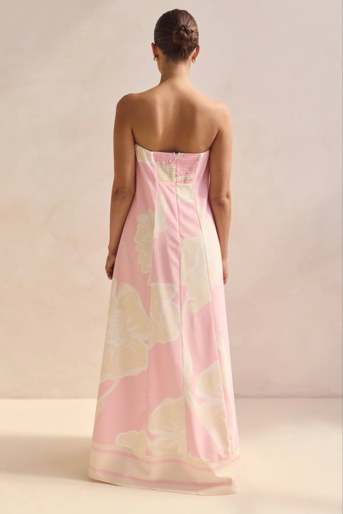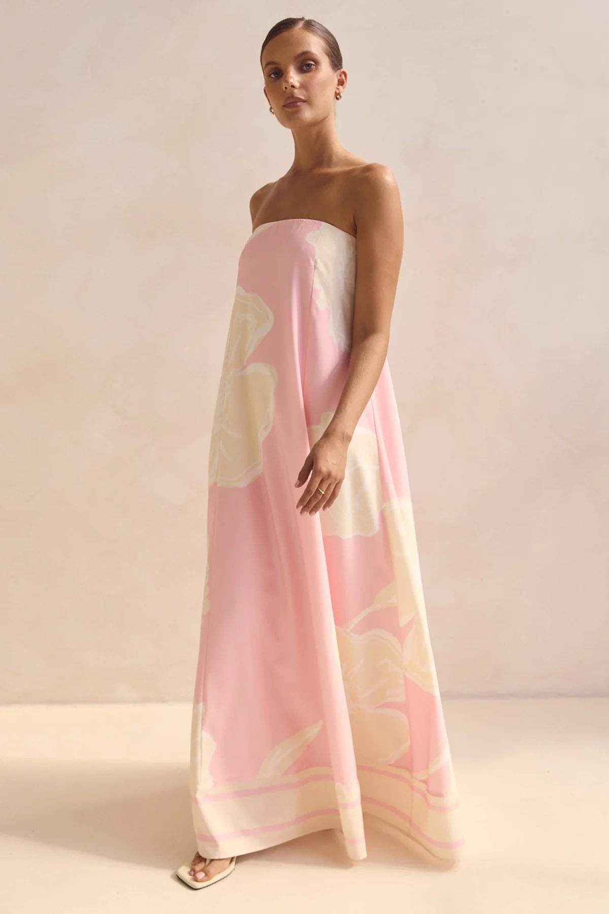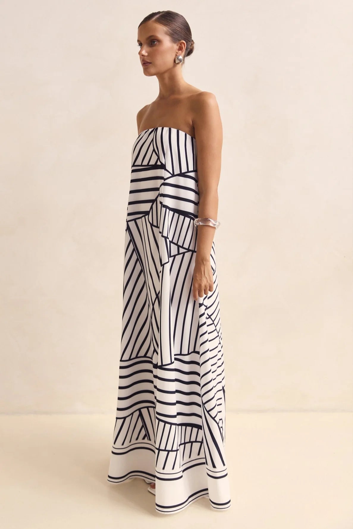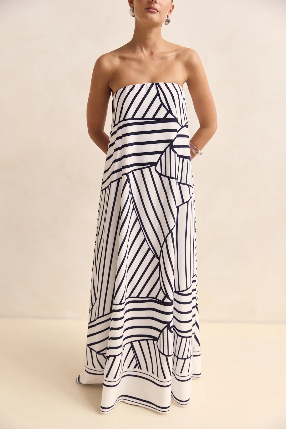 The Sienna Maxi Dress is a bold yet refined piece that exudes quiet sophistication. Designed with a strapless silhouette and a flowing, floor-length fit, this dress moves like a summer breeze. The geometric print adds a modern, graphic touch, while the soft pastel border creates an effortlessly chic finish. Ideal for sun-drenched afternoons, garden parties, or elegant holiday dinners — just add statement earrings and sandals for an elevated summer look.