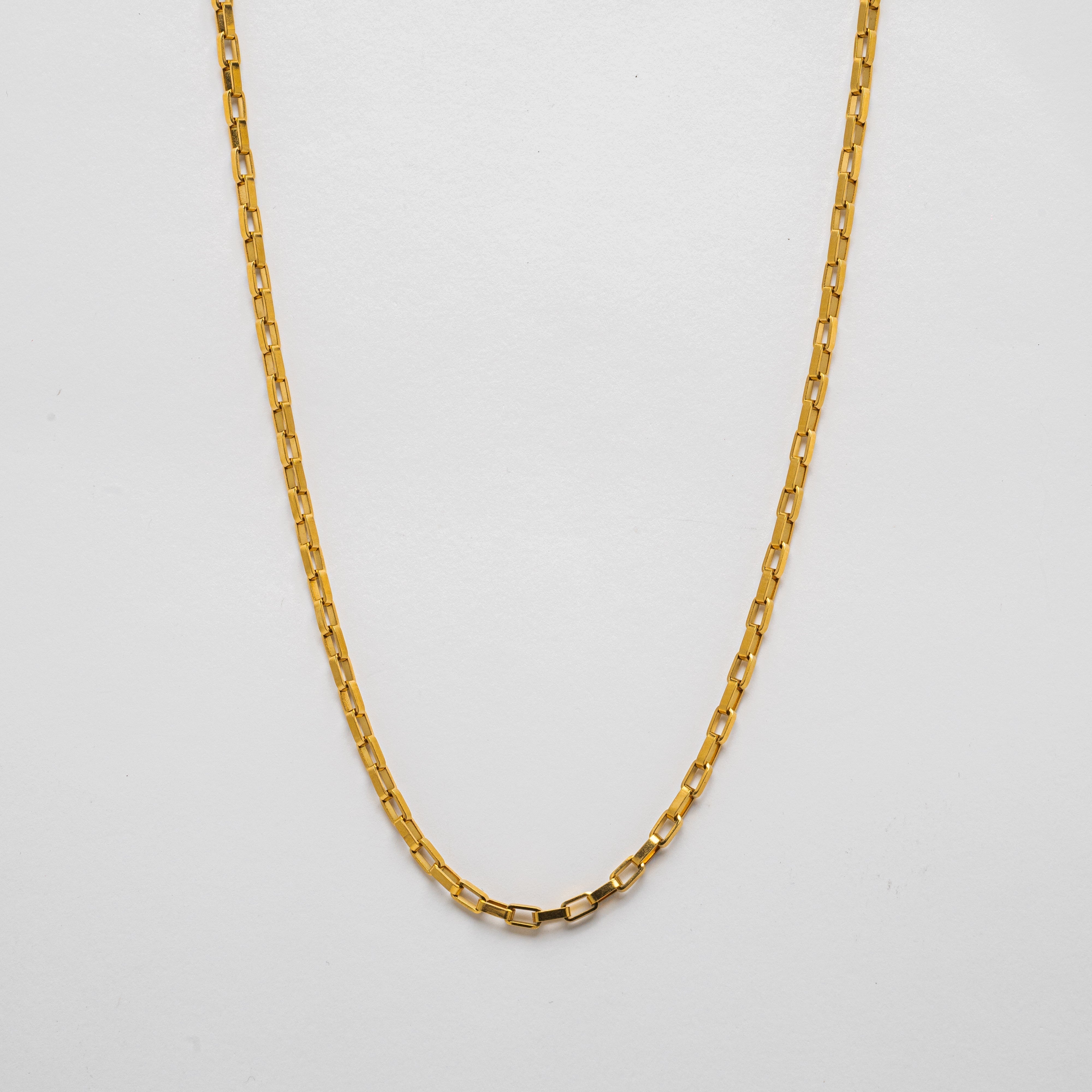 The Venna necklace, with its chain of golden rectangles, features a minimalist design that adds a touch of elegance to both casual and formal outfits.